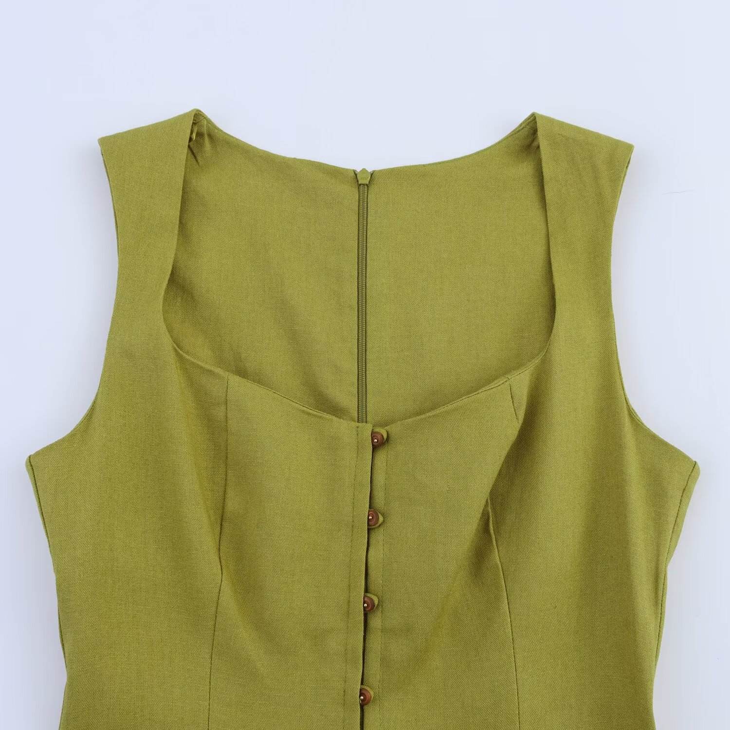 This olive green midi dress is your go-to for clean lines and timeless elegance. Designed with a structured A-line silhouette, a flattering scoop neckline, and delicate front button details, it blends vintage charm with modern refinement.
