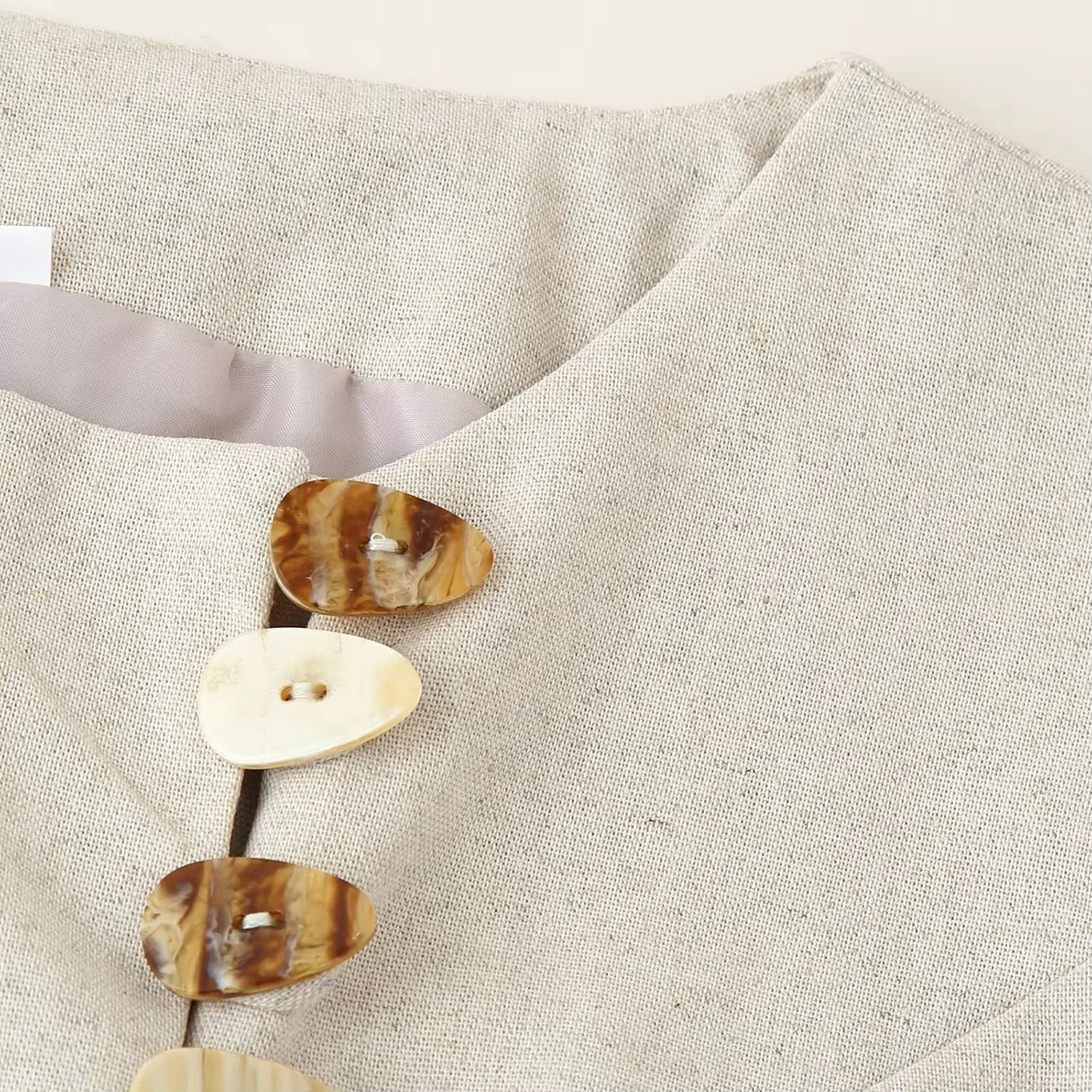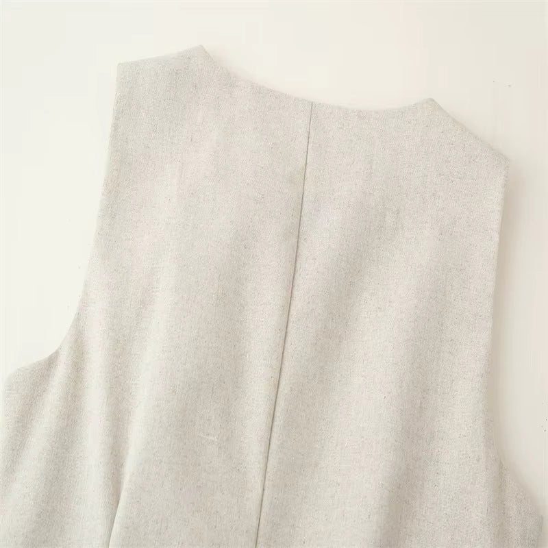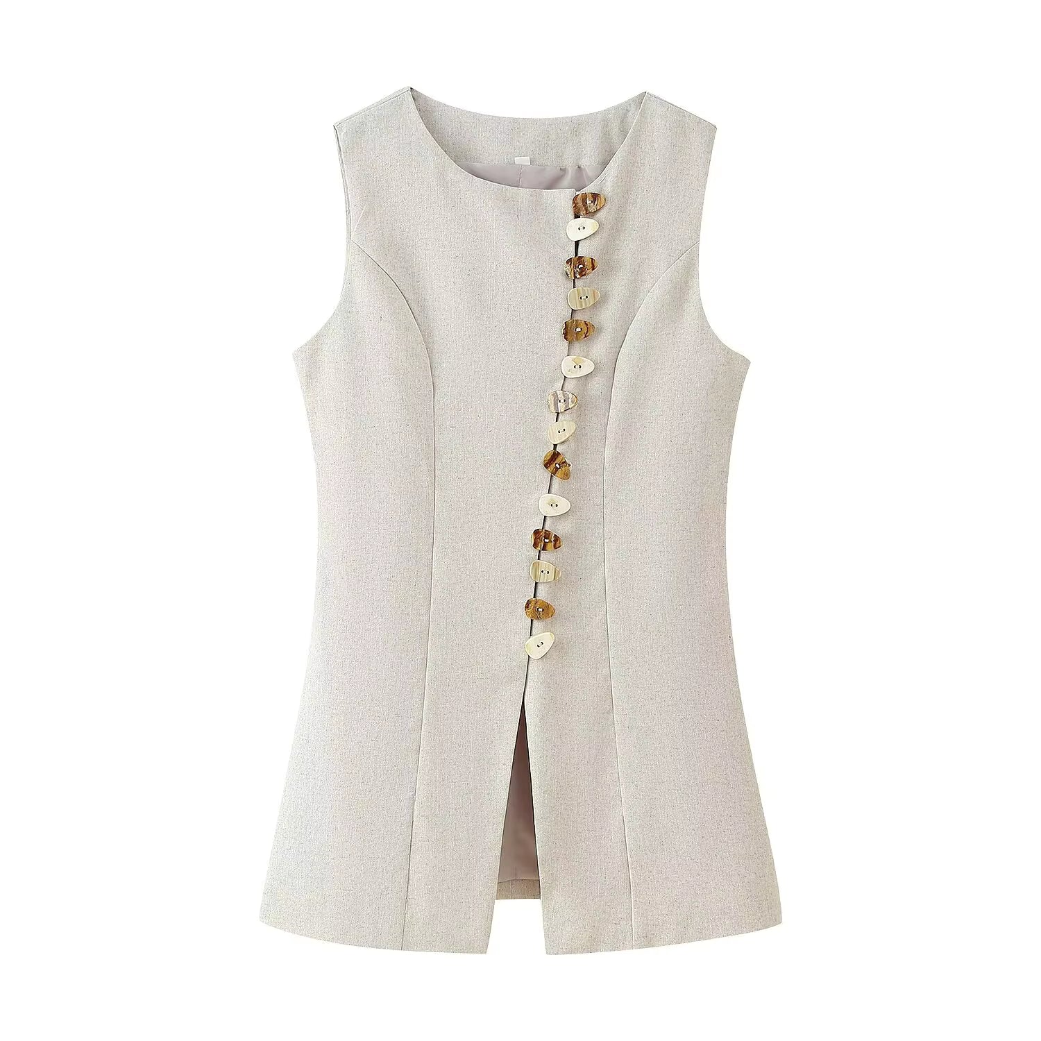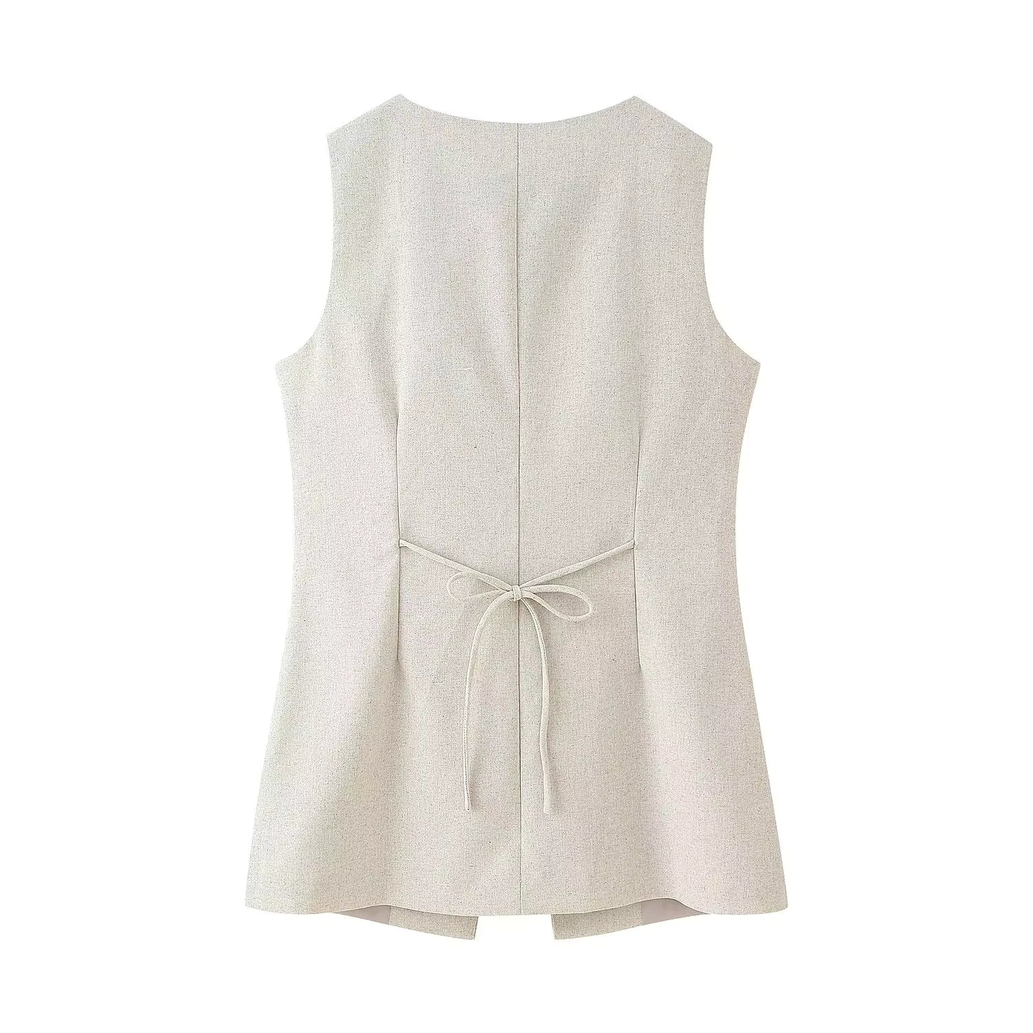 Upgrade your wardrobe with this classic beige tailored vest – a sleek, sleeveless essential that blends structure with style. Designed for the modern woman, this waistcoat features a flattering cut, crisp lapels, and a minimalist button front for a polished finish. Perfect for layering over shirts or wearing solo for a bold statement, it's versatile enough for office wear, evening dinners, or even casual chic days out.